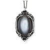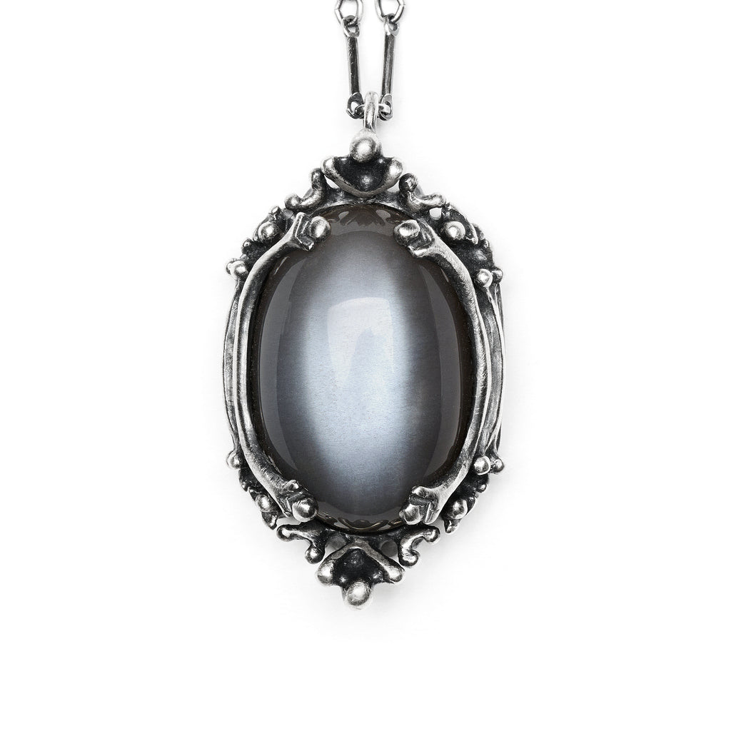 A variation of our beloved Pythia design, this necklace features a setting that echoes the style of a baroque mirror frame. Within, a stunning, slightly domed Grey Moonstone is cradled by cast bat bones.