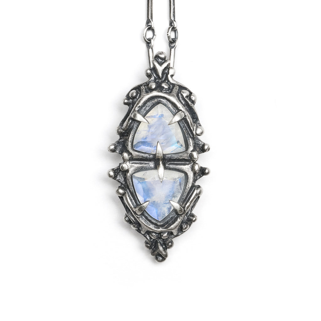 Two petite moonstone trillions are set in opposing directions within a frame of life cast bat bones, a visual talisman of As Above, So Below.