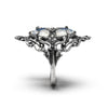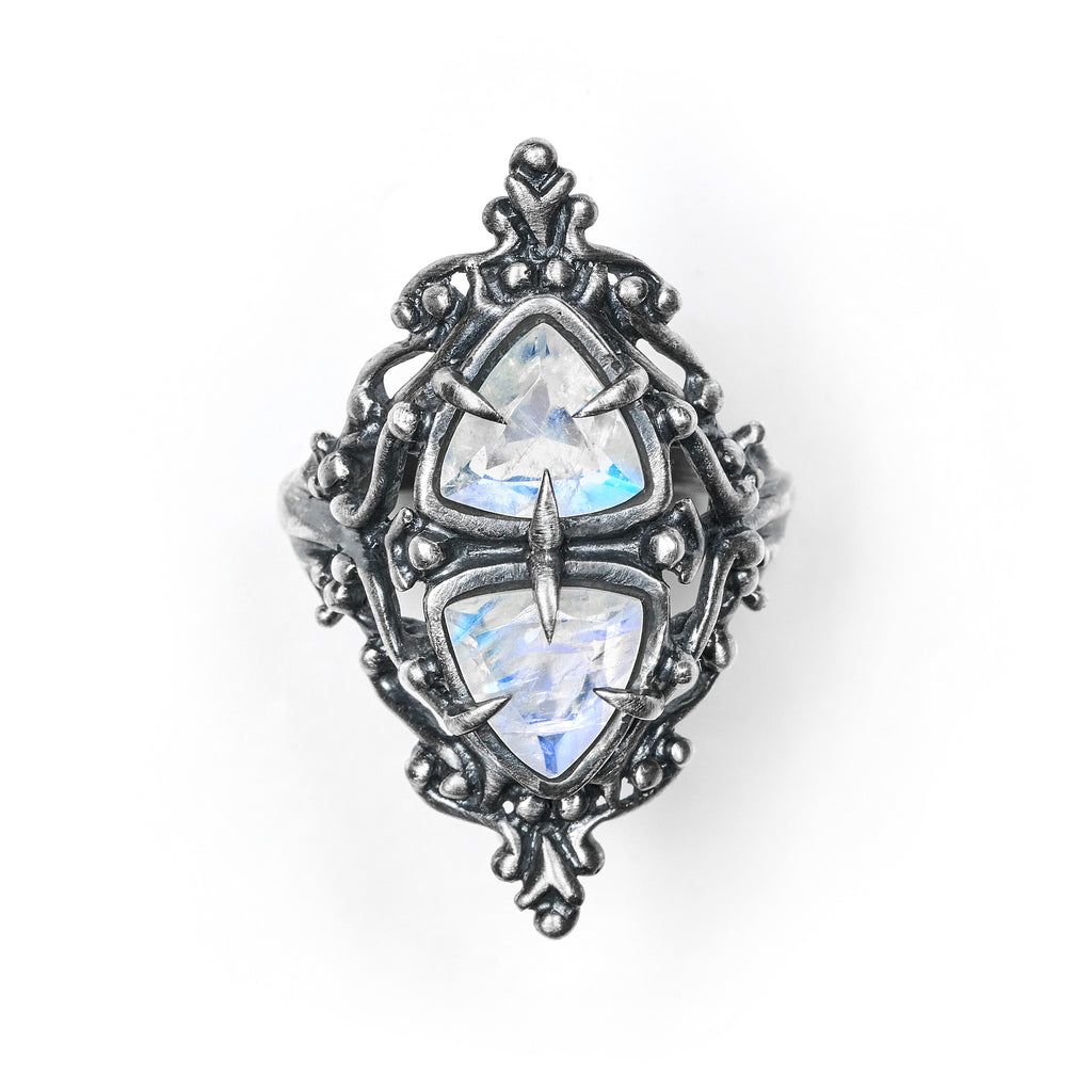 Two petite moonstone trillions are set in opposing directions within a frame of life cast bat bones, a visual talisman of As Above, So Below.