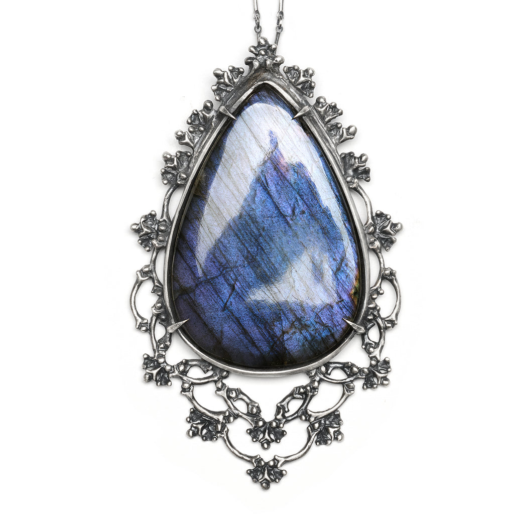 Set in a visual hybrid setting of our ‘bat lichen’ and ‘bat lace’ made from life cast bat bones and meant to evoke both the forest and Victorian morning clothing, this design was also created to reflect the hollow of trees, the inside of shells. A marriage of the natural world and human emotion, this jewel is also an incredible statement piece featuring a purple labradorite gemstone.