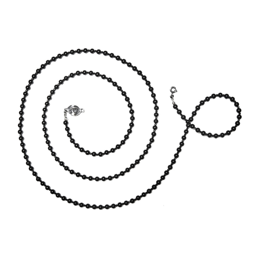 This strand measures 52 inches long from end to end. At its closure is our medium sized double sided, sterling silver Eye talisman clasp, hand oxidized and finished to achieve our signature shade of stormy gray.