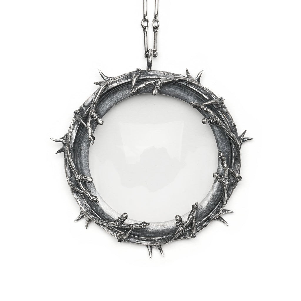 A variation of our 'Guardian' necklace: a Spyglass is cradled in a nest of thorns cast from a Hawthorn tree branch harvested from near the Mima mounds in Washington. Please note that as these thorns are life cast, they are slightly sharp and should be worn and handled with care.