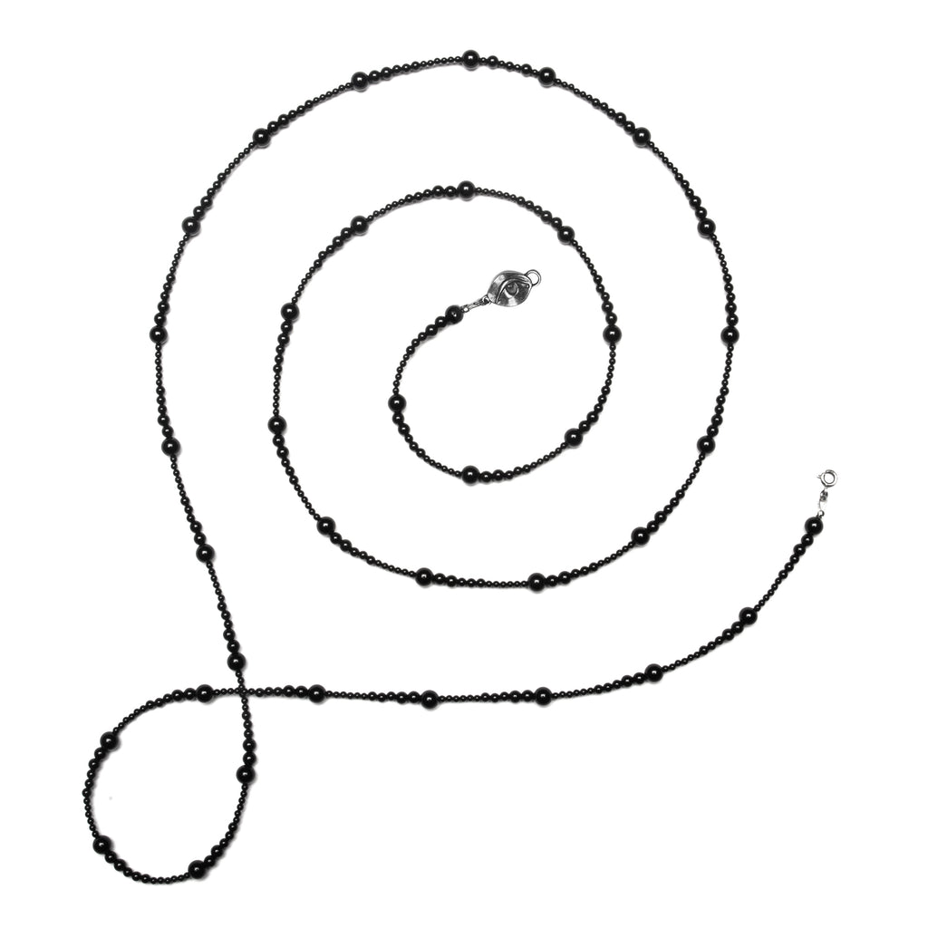 This strand measures 54 inches long from end to end. At its closure is our medium sized, double sided, Eye clasp in sterling silver, hand oxidized and finished to achieve our signature shade of stormy gray.