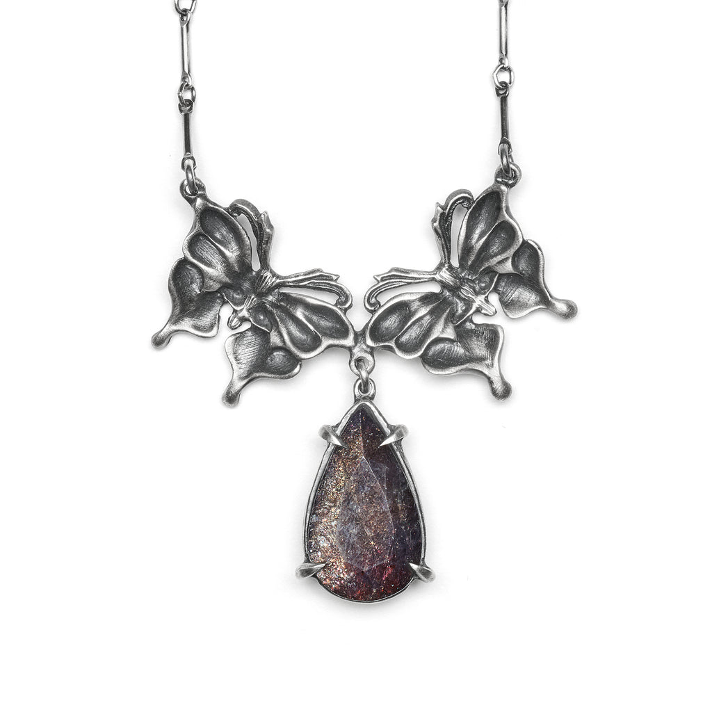 Night Flight. Conjoined Datura Moths and Bloodshot Iolite. Necklace.