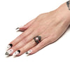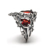 Composed of life cast bat wing bones, this ring is an homage to Persephone, Queen of The Underworld. The three garnet stones represent the tears of grief, as well as the seeds of the Pomegranate.