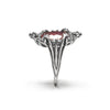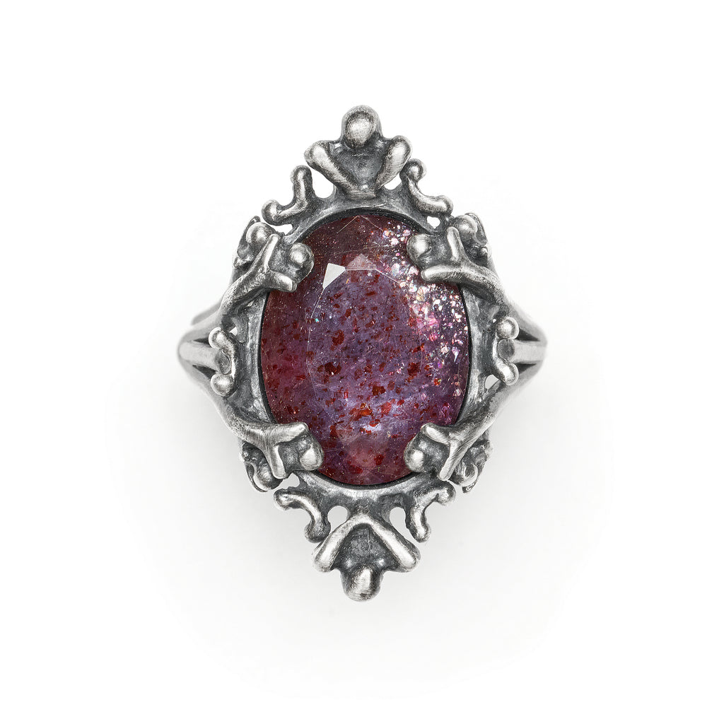 A petite oval cut Bloodshot Iolite is set within a frame of life cast bat bones that echoes the design of the frame of an old mirror or painting. This stunning one of a kind stone appears celestial; silvery gold flecks are layered over interesting inclusions of red iron, while light glitters within a beautifully rich warm bruise color, reminding me of the wonder of the cosmos~ akin to wearing a tiny galaxy on your hand.