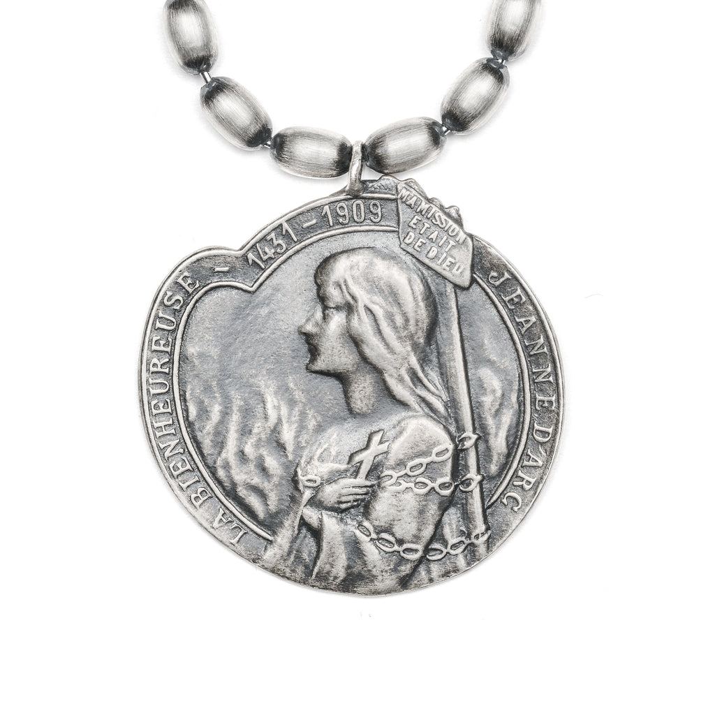 Cast from an antique pendant of Joan of Arc chained to the pyre with flames clearly shown behind her, suggesting she has been set aflame. I have never come across a pendant commemorating Joan at the moment of martyrdom and while certainly macabre, it also feels powerful to me, as even facing death, she refused to denounce who she was and what she believed in.