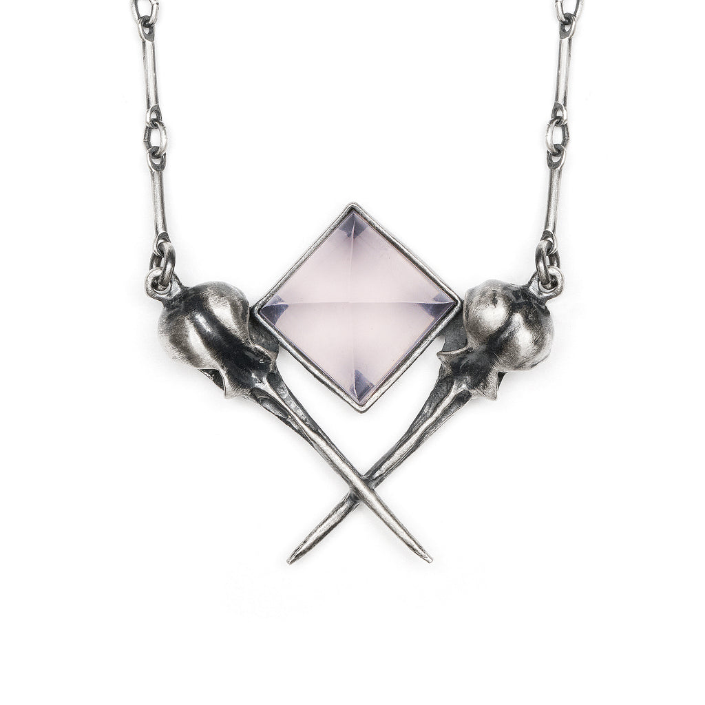 Inspired by a merging of the Afterlife series with the Crystal Tomb series, this necklace features a 10mm Moonstone pyramid cradled by two sterling silver hummingbird skulls. Both collections are inspired by a deep loss I experienced in 2008 after the sudden passing of my father. As a way to seek comfort from my seemingly bottom-less grief, I became interested in how jewelry can take on the feel of a kind of psychic armor.