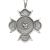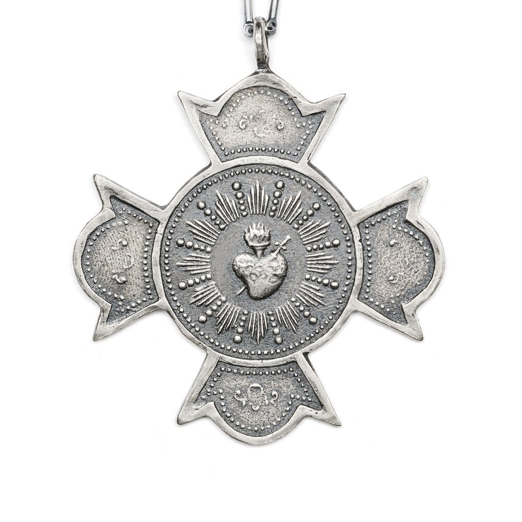 An antique pendant, evoking the Maltese cross long associated with Firefighters, features at its center, the immaculate heart of Mary, belted with roses faded with time and set aflame with fierce love, a dagger is thrust through the side of the heart. Representing the pain of sorrow, I often wonder how much the sea of our hearts is given over the grief, especially these days. While I experienced the Catholic church as a child in small ways through a grandmother I saw only occasionally, the beauty and strangeness of its rituals and art have remained with me throughout the years, especially the worship and devotion to the sacred, disembodied hearts of its son and mother deities. This pendant has particular sentimental significance to me as my much beloved stepfather was a NYC firefighter for over 30 years. Wear as a talisman for fighting fires of all kinds, or as a balm for grief. As a dagger against the dark days.