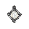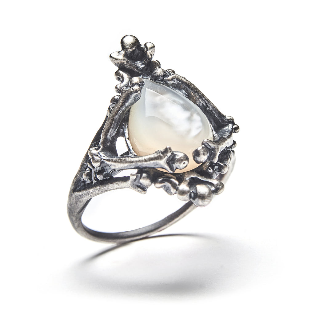 Shaped like a drop of water or a single tear, shed in grief or joy, a glimmering Mother of Pearl gemstone is set in a design composed of cast bat bones that echo the style of a baroque mirror frame.