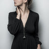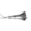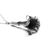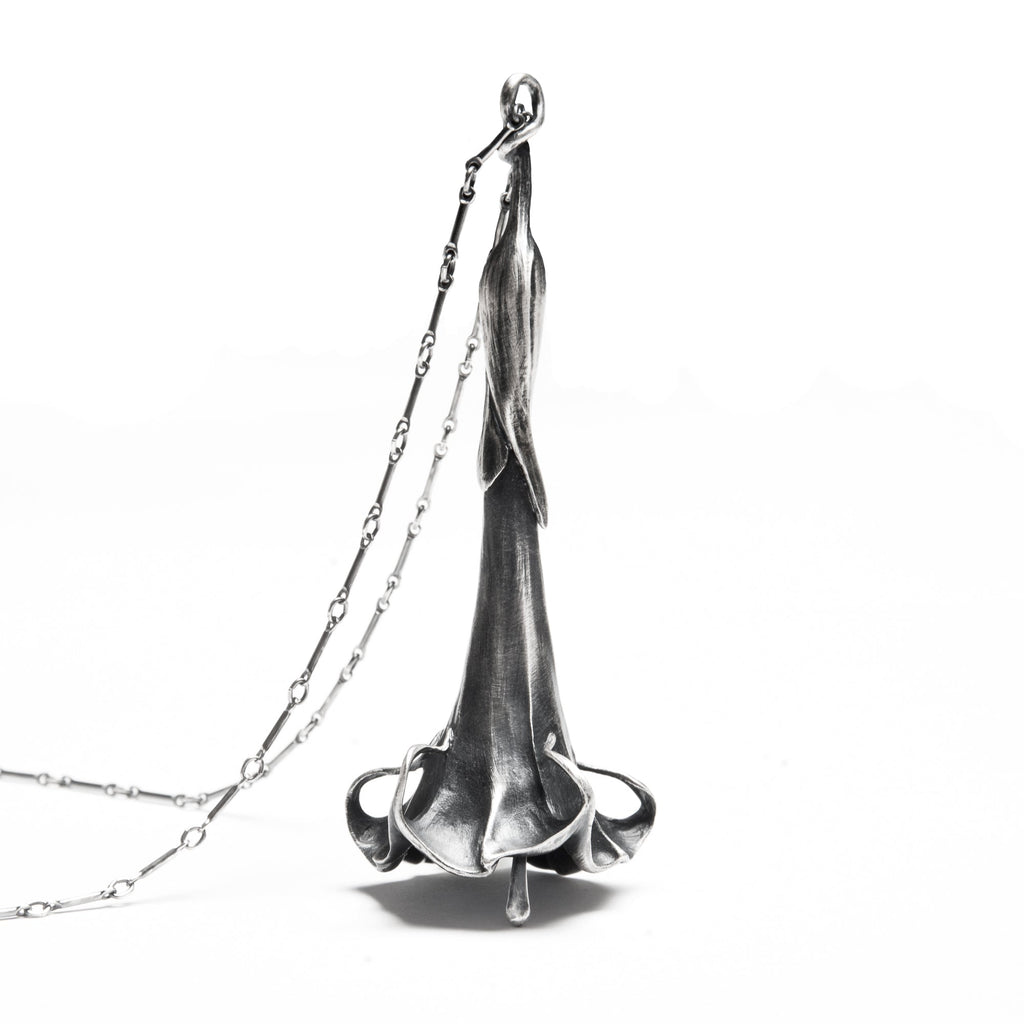 The Datura Bell is hand carved and then cast in sterling silver, oxidized to a gloomy shade of gray and hand finished to reveal the highlights beneath. The bell mechanism is quiet, and can be used for clearing space, summoning, or protection. It is paired with our signature bar link chain in the length of your choosing.