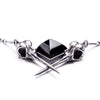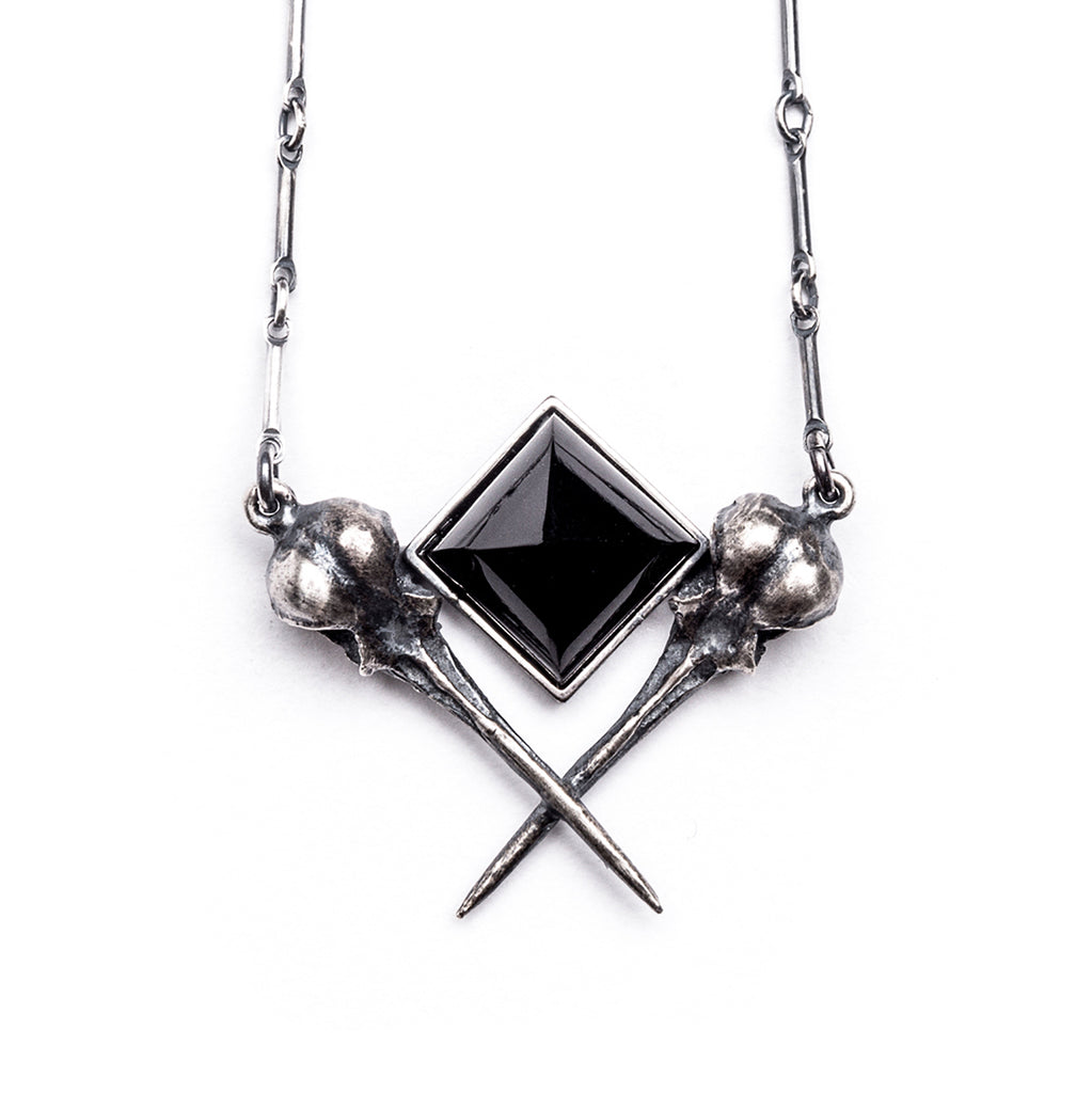 Inspired by a merging of the Afterlife series with the Crystal Tomb series, this necklace features an onyx pyramid cradled by two sterling silver hummingbird skulls. Both collections are inspired by a deep loss I experienced in 2008 after the sudden passing of my father. As a way to seek comfort from my seemingly bottom-less grief, I became interested in how jewelry can take on the feel of a kind of psychic armor.