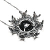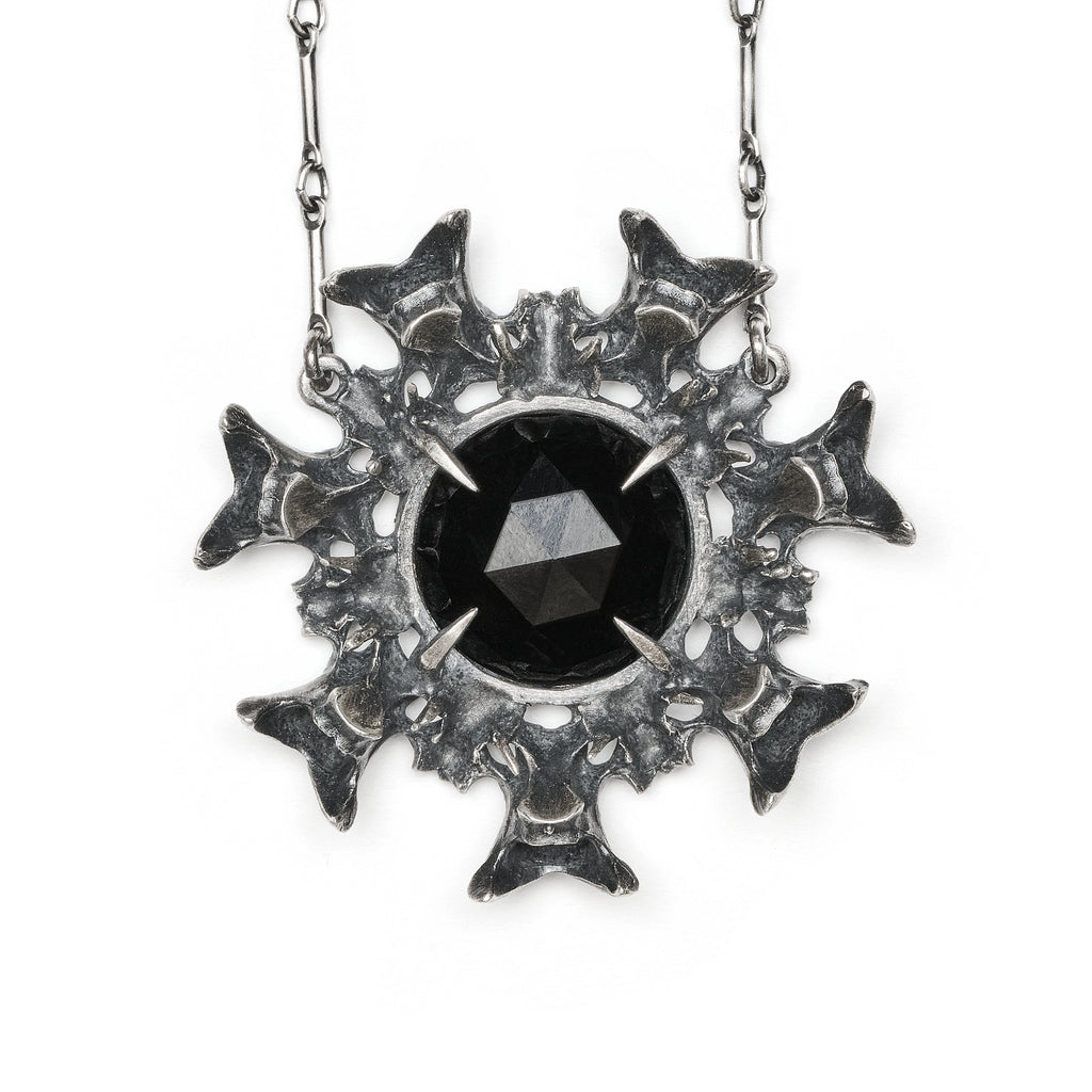 This pendant features both the lunar nature of the owl as well as the solar “death” of the sun, represented by the rose cut onyx gemstone as well as the “rays” of the sun composed of life cast barred owl vertebrae.