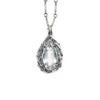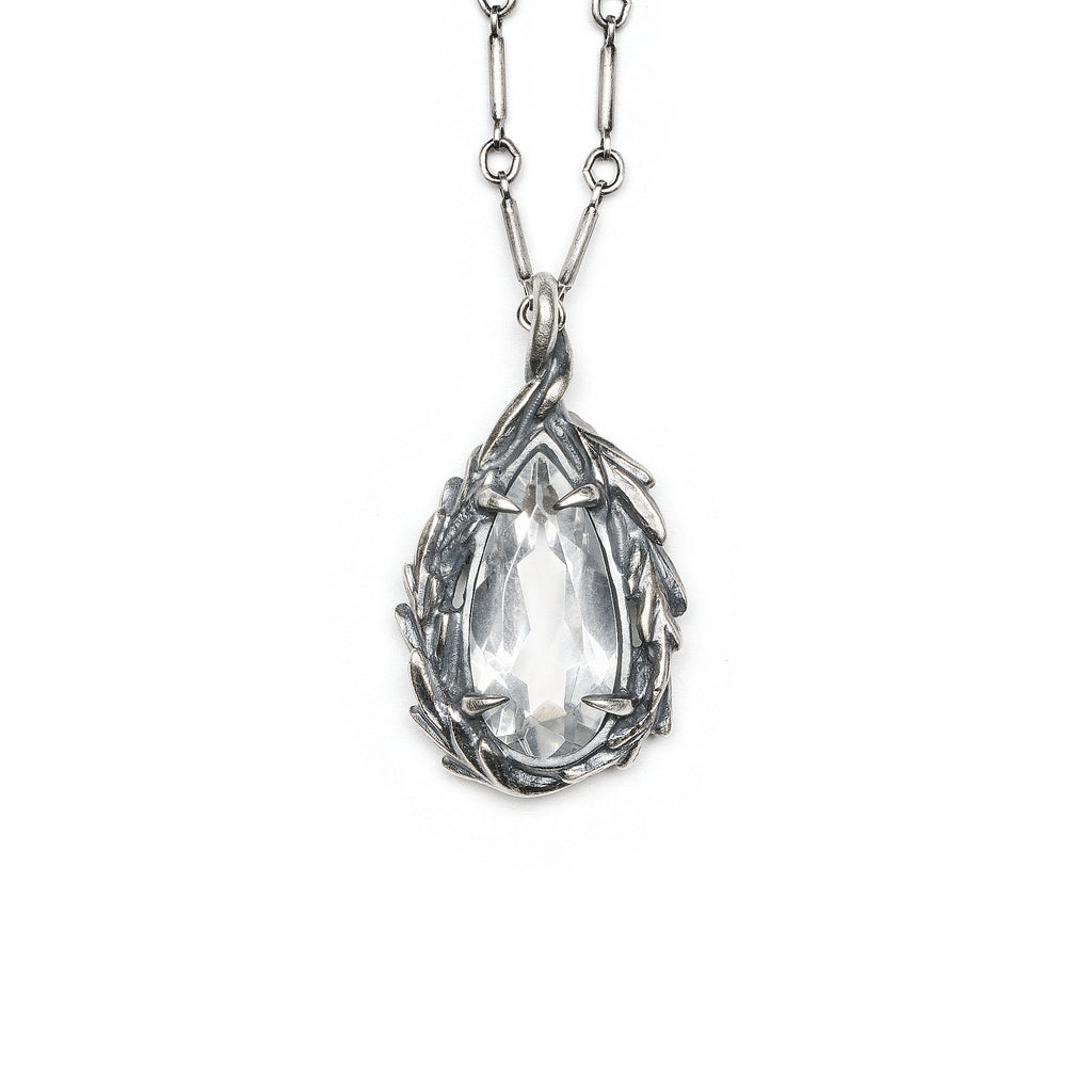 Mugwort leaves, cast immortal in sterling silver, carefully encircle a pear cut clear quartz gemstone, resembling a tear. Historically, Mugwort was used as a dreaming herb, harvested, dried and sewed into little sachets which were then put under the pillow before sleep to "bring forth dreams". These dreams, due to the herb's potency, could be vivid, lucid and prophetic. These attributes have survived throughout the ages and people today still use Mugwort to assist with enhancing dreaming and visions whilst in this state.