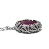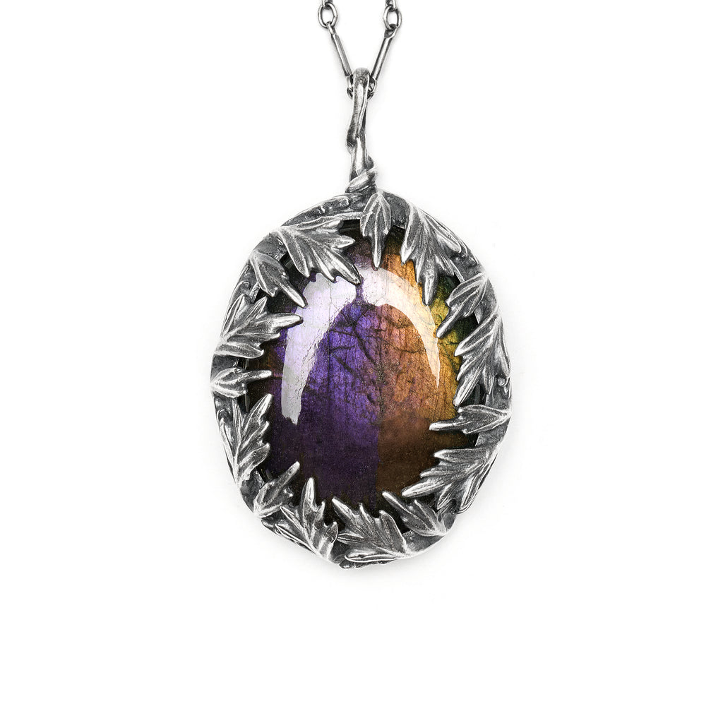 A stunningly unique oval purple labradorite gemstone is set into a wreath of sterling silver Mugwort leaves.