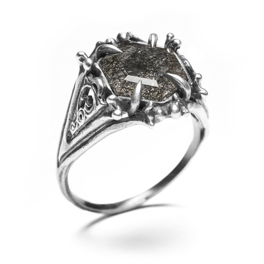 - Set with one 10mm fine cut hexagon Black Tourmaline Quartz stone