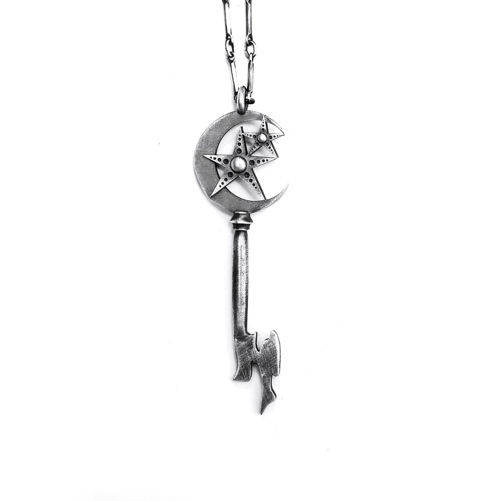 The design of the small circle indents within the stars within the crescent of the keys mirrors the row 'stars' of stones set in the original Endless Night rings, adding a small conversation between the key and the ring. Please note the crescents are ever so slightly sharp, a small signature of a lot of our designs ~ a reminder that while the world may be a little sharp edged, that you have talismanic objects to soothe you.