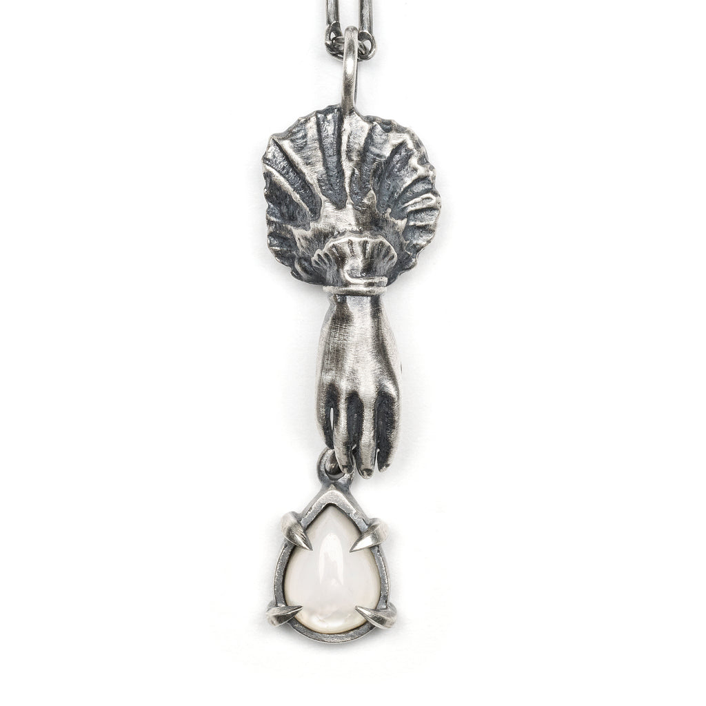 Inspired by one of the first collections I released, my Lily Dale series, this third iteration of 'The Medium' features a petite disembodied, elegant hand emerging from a ruffled sleeve and holding a milky mother of pearl tear.