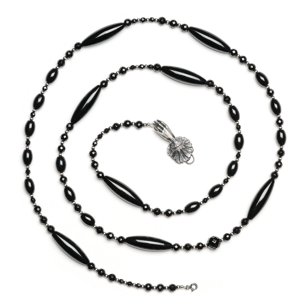 This strand measures approximately 44 inches long from end to end, including clasp. At its closure is our new large Medium's Hand clasp, cast in sterling silver, oxidized to our favorite gloomy grey and finished to highlight the shining silver beneath.