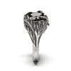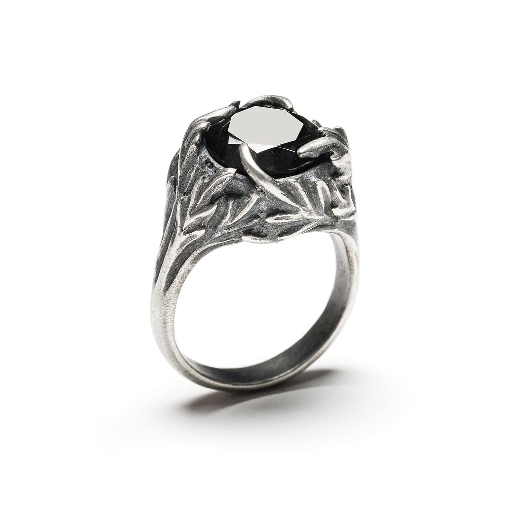 Mugwort leaves, cast immortal in sterling silver, carefully enfold a fine cut round Onyx gemstone, which invokes a reflective "black mirror" in miniature. Created to be worn during divinatory workings both in waking and dreaming conditions, this ring is intended to act as both protection and a means to amplify and aid intuitive and enchanted states.