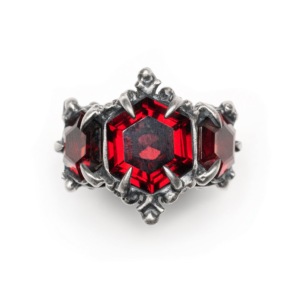 Three hexagonal garnet gemstones are cradled by a setting composed of life cast bat bones, made in companion to the themes of the Pythia series. Inspired by the prophecies the Pythia gave in ‘gibberish’, which were thought to be translated by priests into hexameter verse, each stone therefore represents an ‘oracle’ or divination in ‘hex’ poetry. Meant to be worn as a talisman for divination, wear this ring when channeling inspiration from Apollo, the God of prophecy, oracles, music and poetry,- or- from the divinations and oracles you may be divining, for either yourself or others.