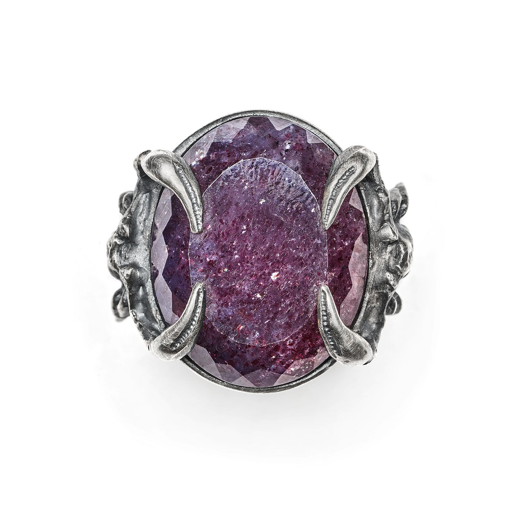 A gorgeous oval cut Bloodshot Iolite fine gemstone ( Iolite Sunstone ) is cradled between twin silver scorpions, each meticulously detailed as in life. This stunning one of a kind stone appears celestial; bright flashes of color and light glitter within a beautifully rich warm bruise color, reminding me of the wonder of the cosmos~ akin to wearing a tiny galaxy on your hand.