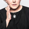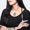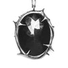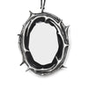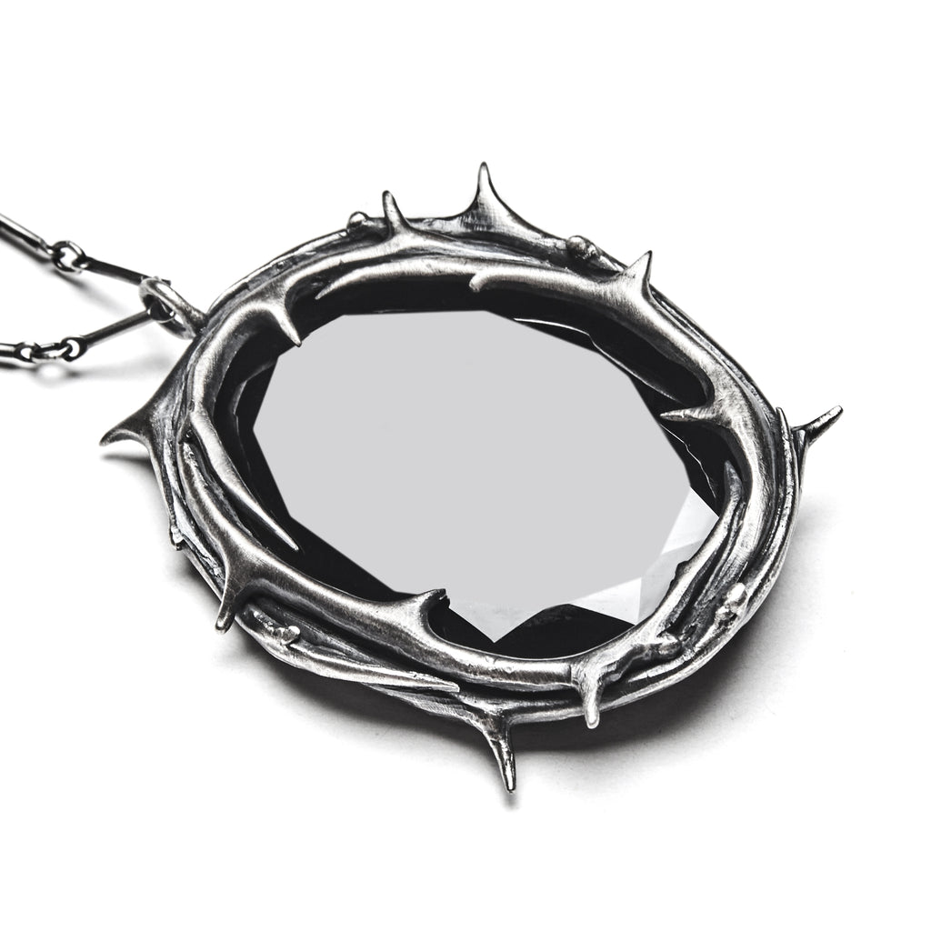Here, a frame of layered thorns encircles a faceted oval onyx which adds an extra layer of protection over your heart, both worn close to the body. The shape is reminiscent of both a black scrying mirror and pool of dark water collected in the woods after a storm; intensely sharp around the edges and smooth on the center surface of the stone.