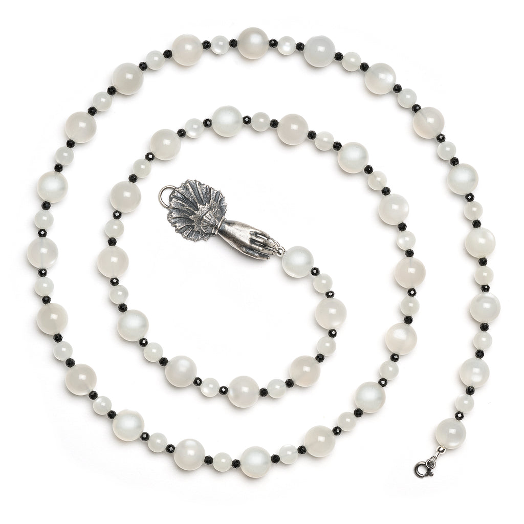 This strand measures approximately 31 inches long from end to end, including clasp. At its closure is our new large Medium's Hand clasp, cast in sterling silver, oxidized to our favorite gloomy grey and finished to highlight the shining silver beneath.