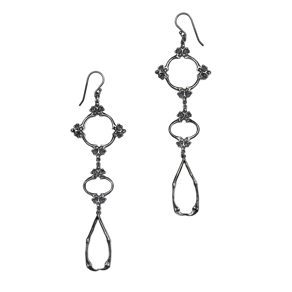 This listing is for one pair of The Weeping Pythia Earrings, oxidized to achieve our favorite shade of stormy gray and then hand finished to reveal the bright luminous silver highlights. Each earring hangs from a sterling silver ear hook.