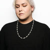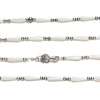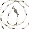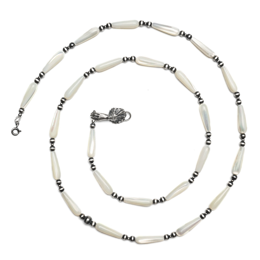 Milky and slightly iridescent Mother of Pearls with interesting inclusions in the shape of tears are paired with sterling silver hollow “pearls”. Designed to be a companion to our previously released Mother of Pearl rosary strand, this special piece was inspired by devotional beads, worn or used in prayer and in times of grief.