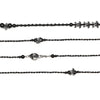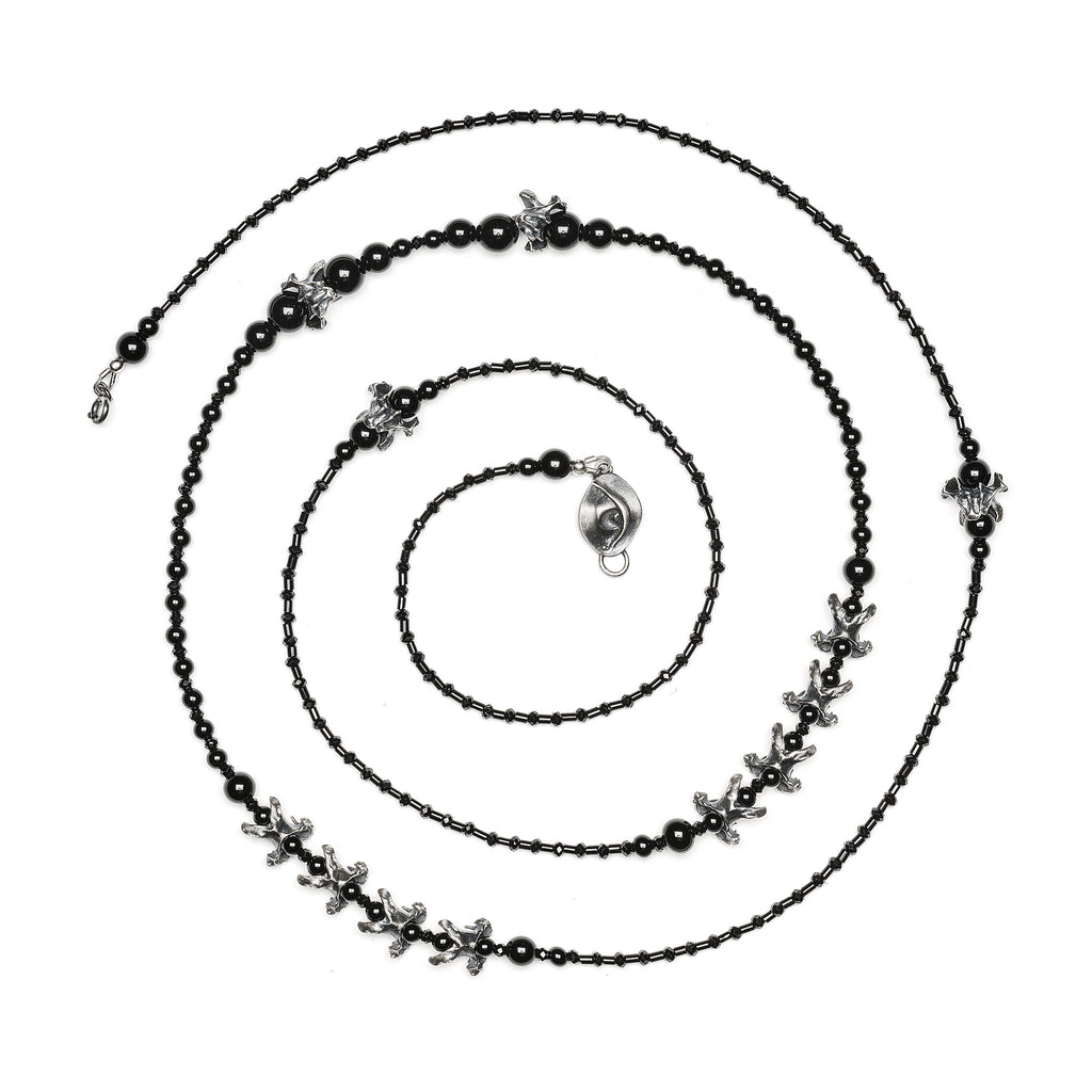 This strand measures approximately 44.5 inches long from end to end. At its closure is our medium Eye Clasp, cast in sterling silver, oxidized to our favorite gloomy grey and finished to highlight the shining silver beneath.