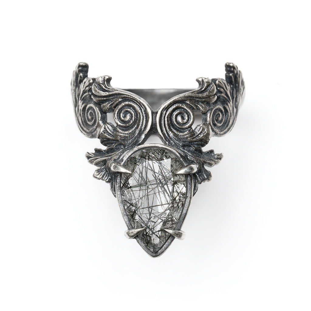 Inspired by the design elements of the Baroque and Neo-classical periods, this striking yet delicate ring is named for the Ancient Greek God of the West wind, Zephyrus, features conjoined ornate 'wind gusts' cradling a stunning pear cut tourmalated quartz. These calmer winds are also named for those that occur as a storm ends, and this petite line of jewels represent the transitions of life's ups and downs, just as raging storms ease to lighter rain and the parting of clouds that give way for sunshine to break through. It's difficult to know what treasures may be blown down towards us on gentle breezes, especially these days, but it's my hope that this jewel may be a talisman of hope for calmer weather in both our external and internal landscapes.